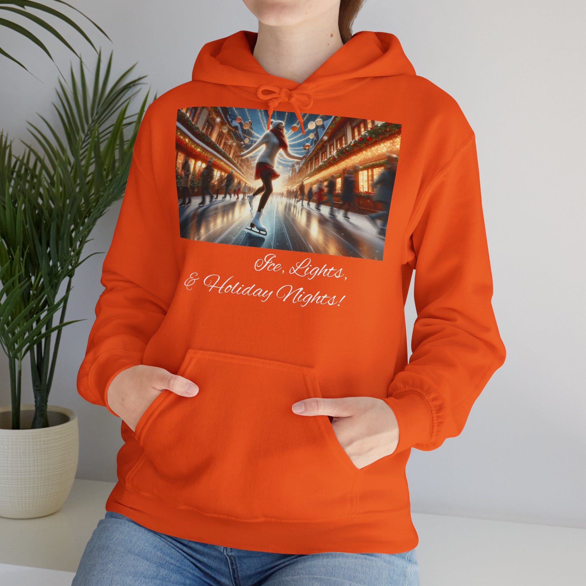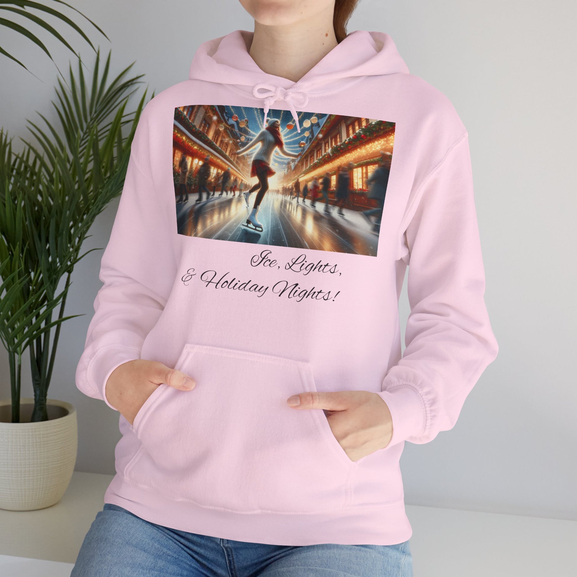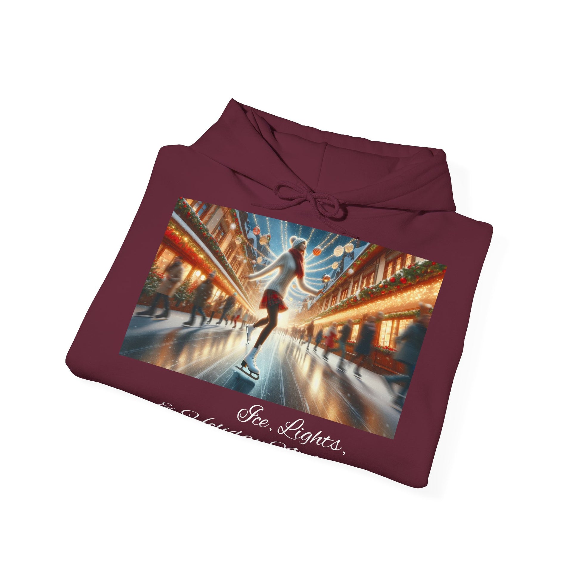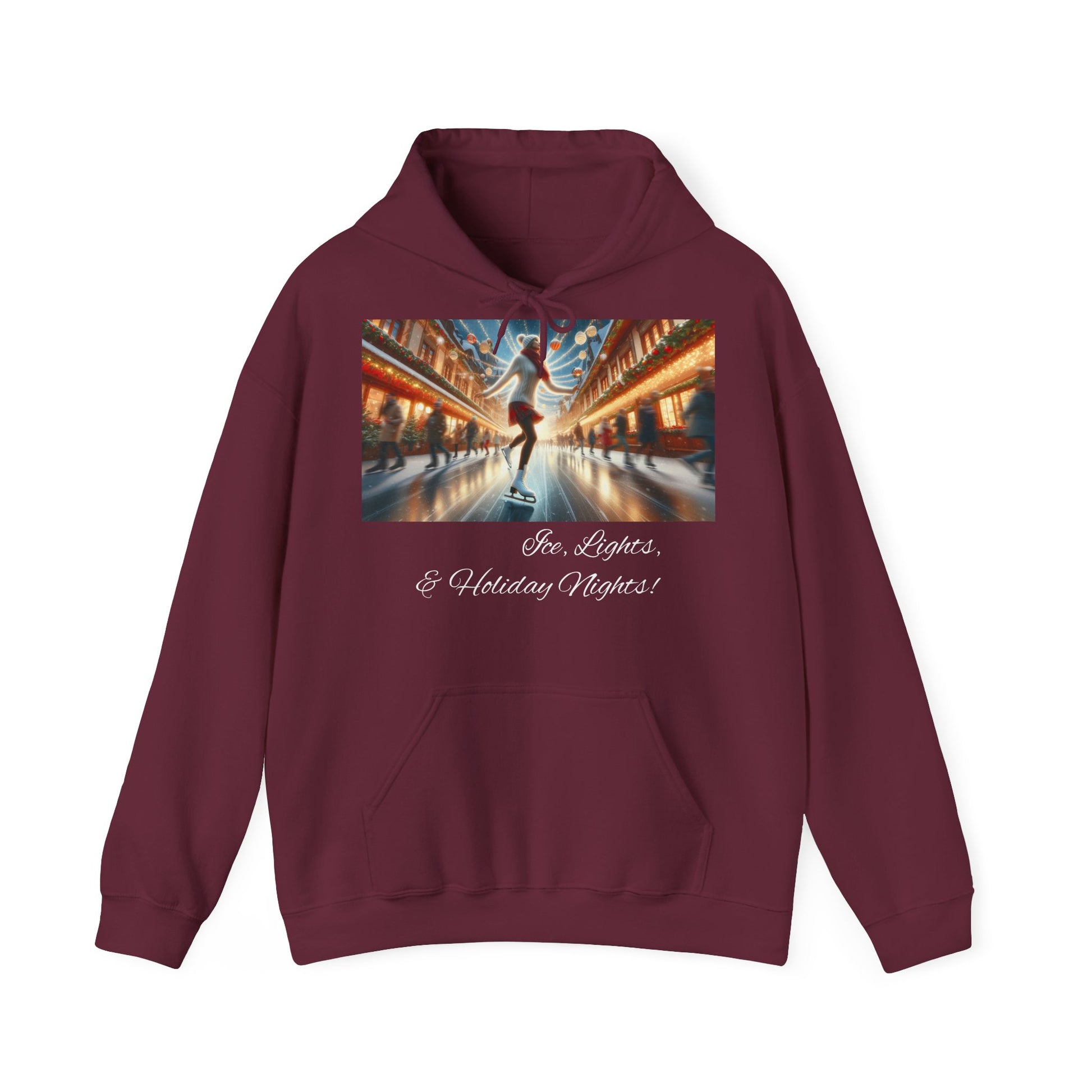 This cozy Hoodie features a festive design of a lady ice skating on a Christmasy backdrop, giving off a cozy holiday vibe. Perfect for those who love the holiday season and enjoy staying warm and stylish. Great for Christmas celebrations and winter gatherings.