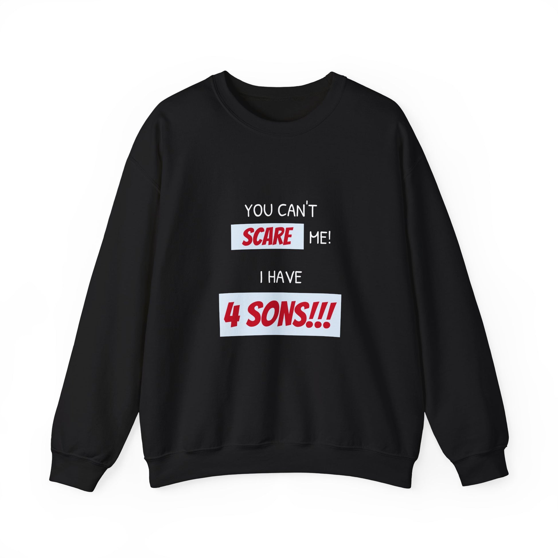 This women's Sweatshirt features the text 'You can't scare me, I have 4 sons' and a cool looking WordArt for a mom with 4 sons. It exudes a sense of family pride and strength, making it a perfect gift for moms with 4 sons. Ideal for Mother's Day, birthdays, or any occasion to celebrate motherhood.